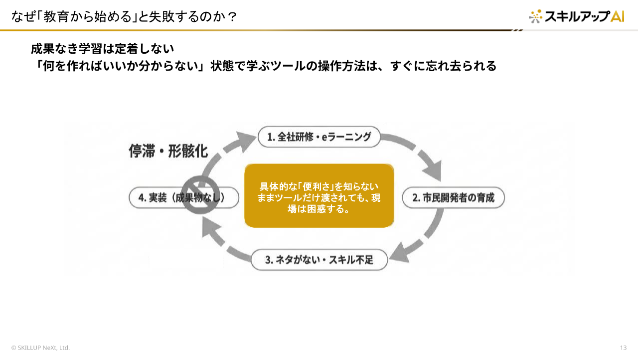 私は日々、多くの企業が陥りがちな「負のループ」について警鐘を鳴らしています。それは、「AIを導入しよう」と意気込んで、全社研修やeラーニングから始めてしまう「教育先行型」のアプローチです。現場のユーザーは「何ができるかわからない」状態で操作方法だけを教えられても、自身の業務での具体的な活用イメージが湧きません。結果として「自分の業務がどう便利になるのか?」という疑問だけが残り、プロジェクトが形骸化してしまいます。
