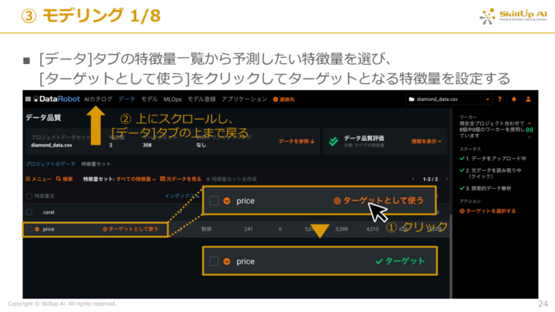 次に、読み込んだデータをDataRobot上で確認してみます。