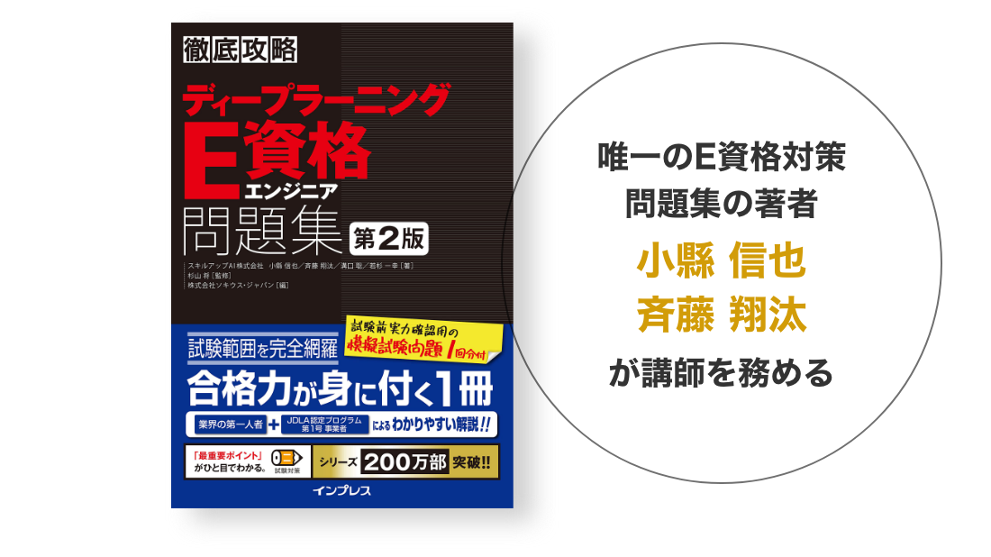 E資格2024#2以降のシラバスに対応していますか?はい。本講座は、E資格2024#2シラバスで追加された試験範囲にも対応しています。試験範囲に追加された内容を扱う教材として「E資格のための補足資料(E2024#2対応版)」をご用意しております。
